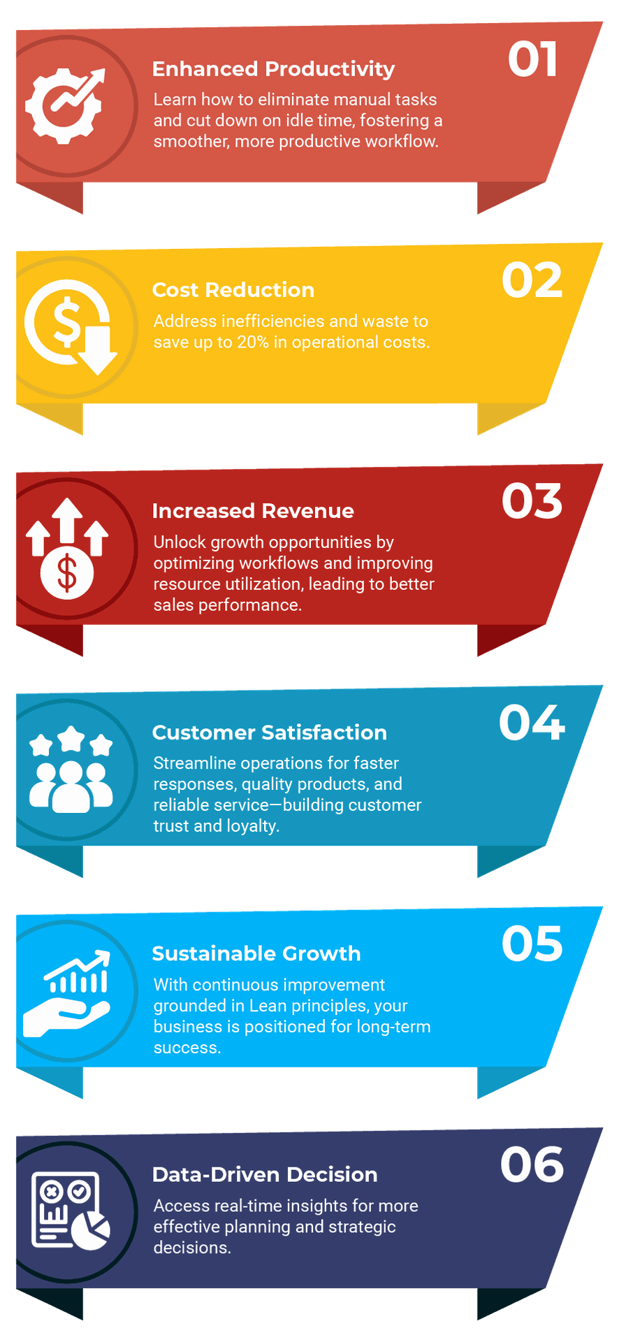 Whether it’s reducing time waste, cutting costs, or boosting productivity, we’ll ensure your team is ready to implement sustainable changes for long-term growth.